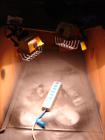 ![]() This is my U-Haul hanging clothes box paint booth. It actually serves my needs pretty well! The halogen lights really speed the drying and I have a mini Vornado fan that I aim into the box after I'm done spraying. I masked the openings from the inside. |
